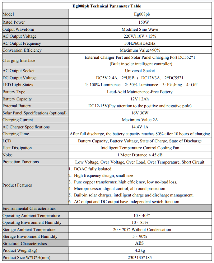 It is prohibited to connect half wave (hair dryer, electric heating wire heater) load, high-power motor, laser printer, high-power rectifier load. The portable power station will be automatically protected because of the excessive starting power during operation.