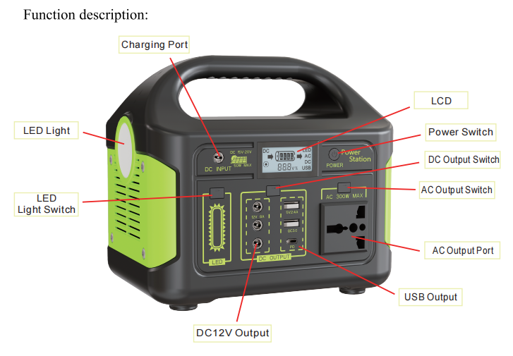 1. When there is no charging, press the power switch on the panel for more than 3 seconds, release it after the LCD display lights up, and then press the corresponding function switch at this time, there will be a corresponding output. If the corresponding function switch is not pressed within 10 seconds, the portable power station will enter the automatic shutdown state.